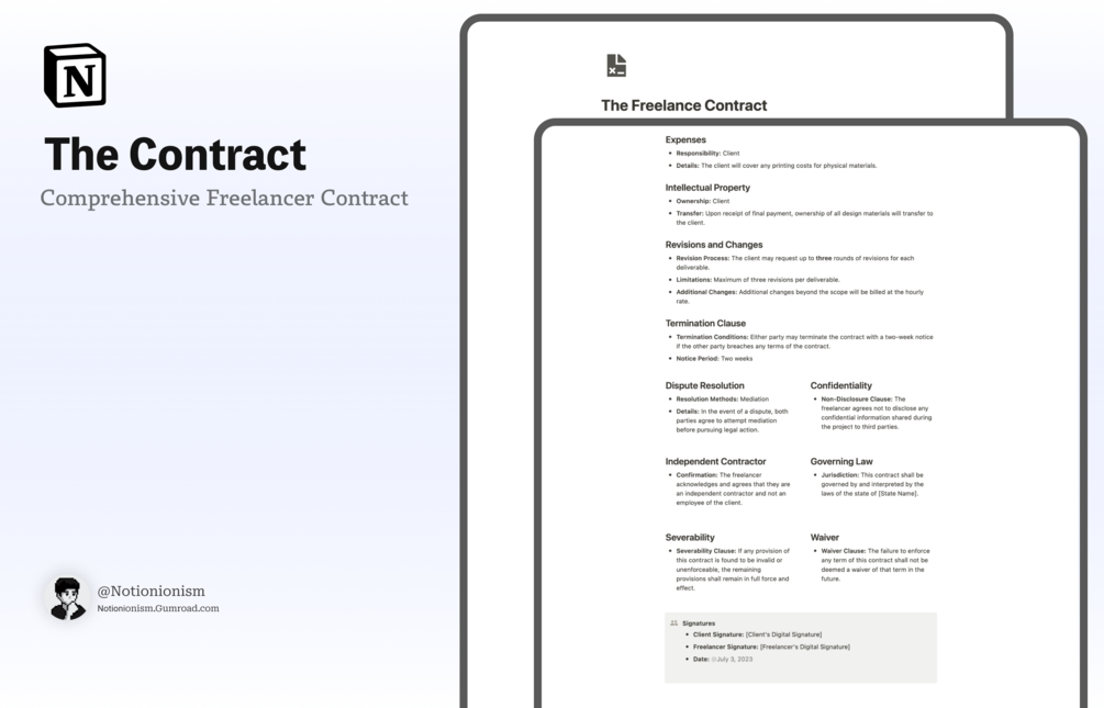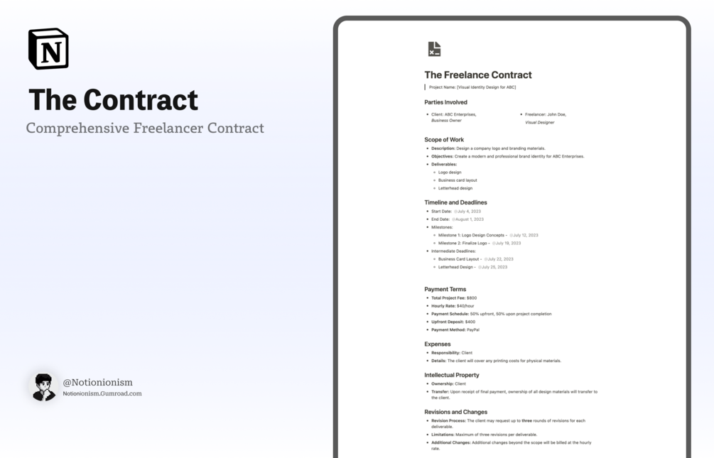 The Comprehensive Freelance Contract Notion template provides a solid foundation for freelancers and clients engaging in various projects. This template simplifies the process of outlining project specifics, defining terms, and clarifying expectations. With predefined sections covering essential aspects such as scope, payment, confidentiality, and more, this template ensures a clear and professional agreement that benefits both parties.