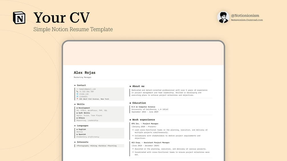 "Your CV" – the Simple Notion Resume Template. Create a professional resume easily with this clean and straightforward template. It provides a smooth and organized layout for showcasing your skills and experience. Create a lasting efficiency with a simple yet elegant design. Whether you're a student, a professional, or a job seeker, "Your CV" is the perfect choice for crafting your resume. Get started on your job search today with this Notion resume template.
