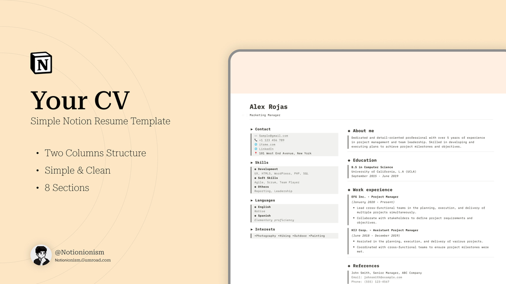 "Your CV" – the Simple Notion Resume Template. Create a professional resume easily with this clean and straightforward template. It provides a smooth and organized layout for showcasing your skills and experience. Create a lasting efficiency with a simple yet elegant design. Whether you're a student, a professional, or a job seeker, "Your CV" is the perfect choice for crafting your resume. Get started on your job search today with this Notion resume template.